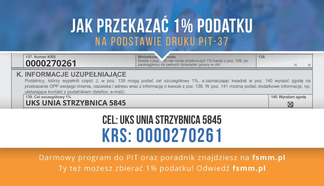Aby przekazać 1% podatku należy w rocznym zeznaniu podatkowym w odpowiedniej rubryce wpisać KRS: 0000270261 oraz cel szczegółowy UKS Unia Strzybnica 5845.